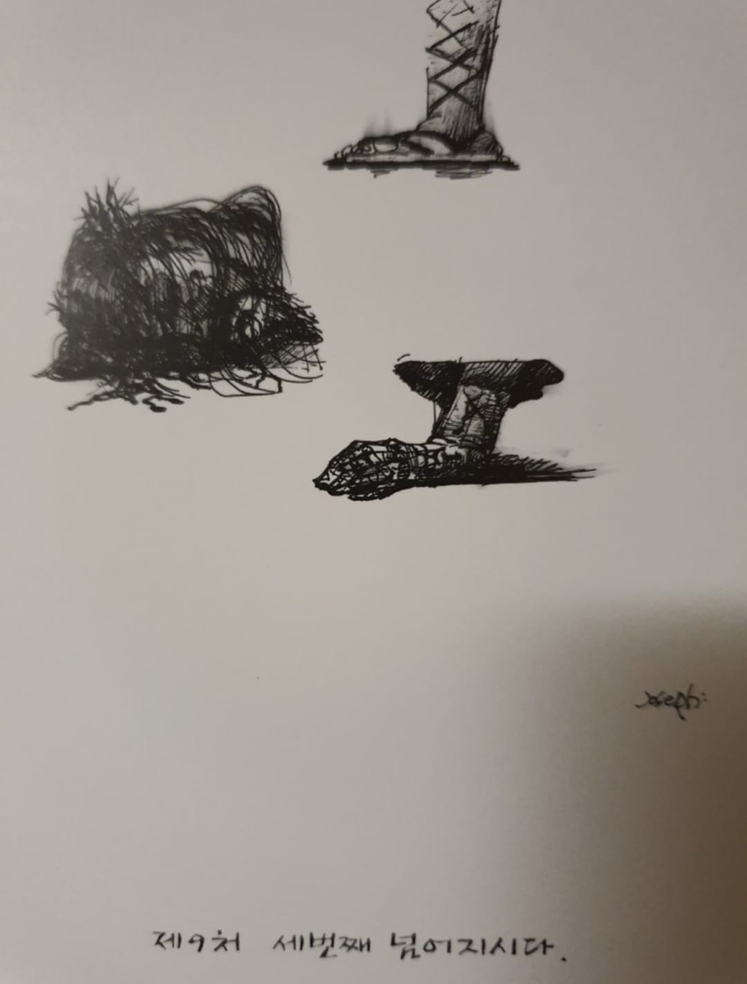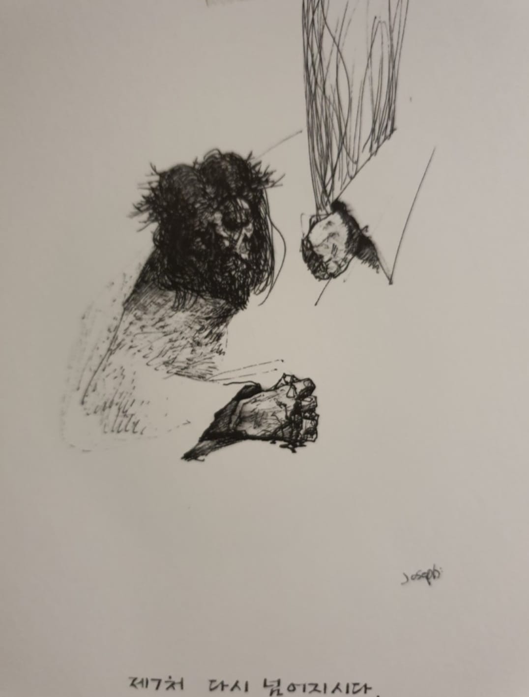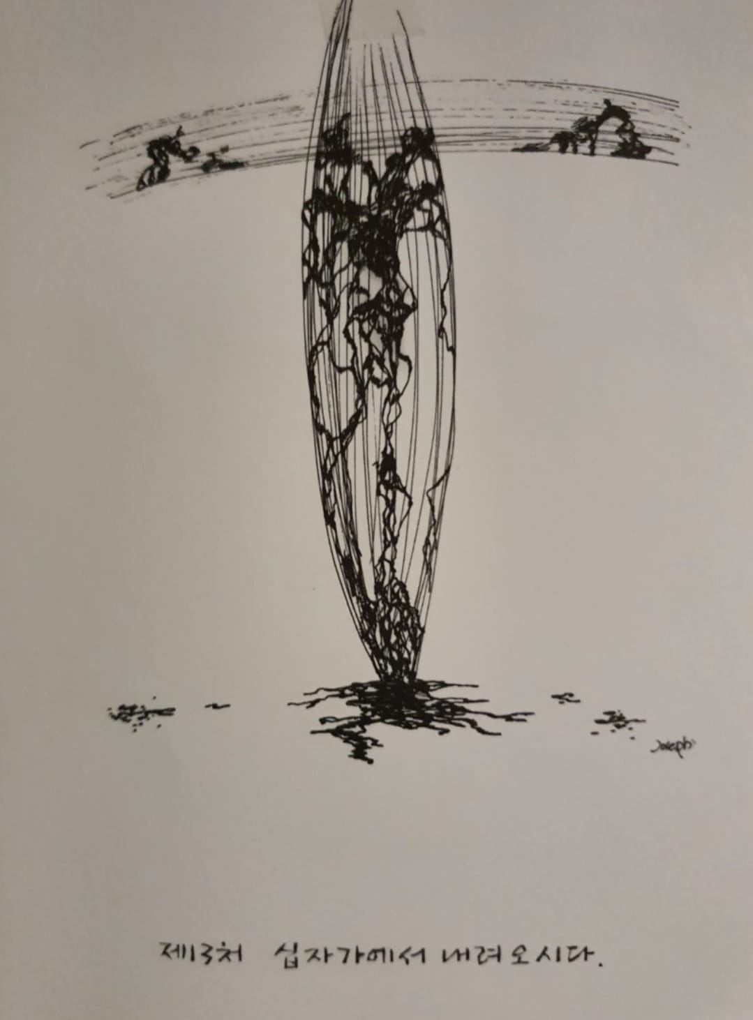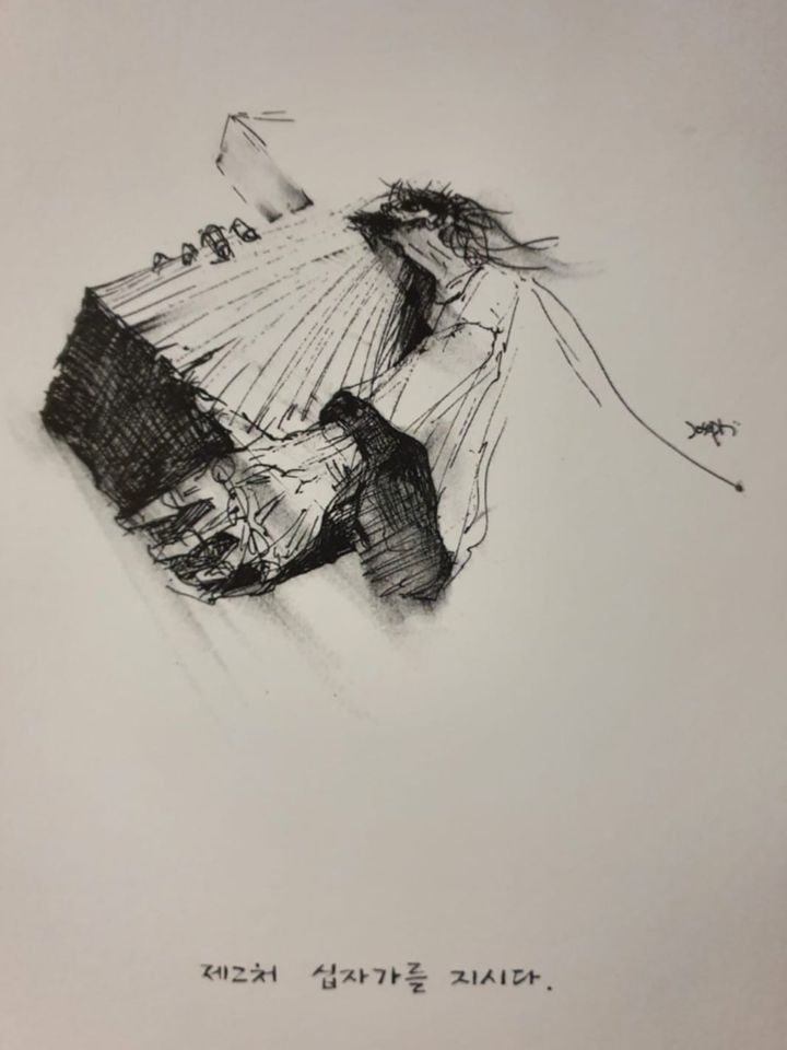 보통 성당의 십자가의 길이 부조인데 이곳은 흰종이에 검정색 펜으로 그린 그림이다.
