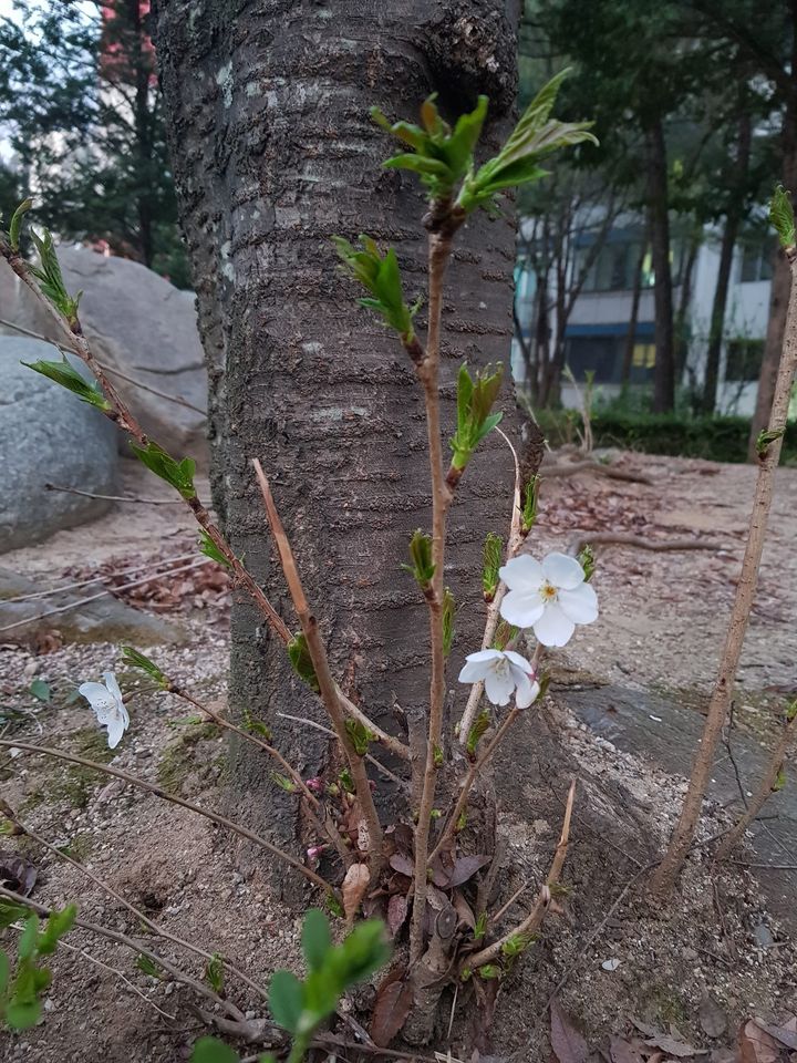 벚나무 뿌리에서 새순이 돋아 나온 가는 줄기에서도 예쁜 꽃을 피웠습니다.