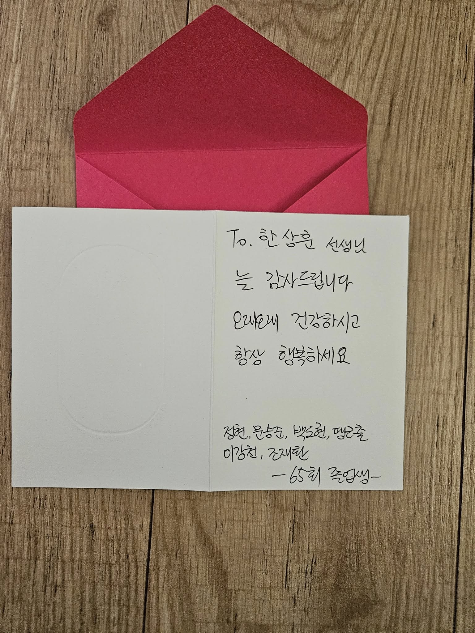 88년 입학하여 92년 졸업한 65회 졸업생에게 전화가 왔다. 졸업한지 33년 된 함께 늙어가는 제자들이 식사하며 술 한잔 대접하겠다고 참치 횟집에 선생님들을 초청했다. 아이들도 보고 함께 근무했던 선생님들도 만나 옛날 추억을 되새기며 그 때는 몰랐던 이제는 말 할 수 있는 이야기도 듣고 또 요즘 살아가는 이야기도 하며 흥겨운 시간을 보냈다. 일차로 부족하여 이차로 입가심한다며 맥주집으로 데려가 추억도 더 나누었다. 그리고 정성스런 카드와 함께 선물도 안겨줬다.