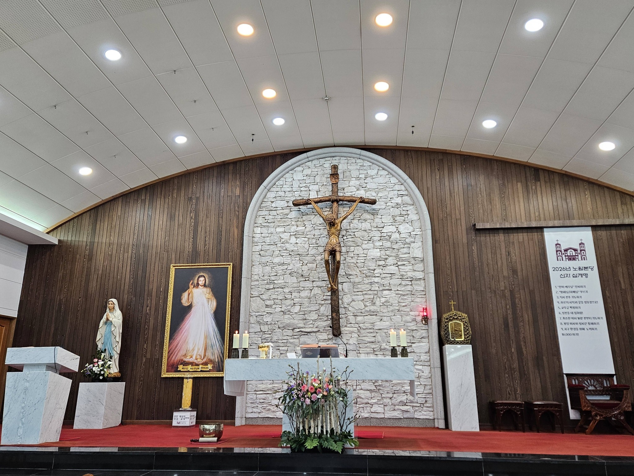 성당 문을 열고 들어가니 주보를 나누어 주는 봉사 단체 레지오 마리애 단원이 한 분 계셨다.