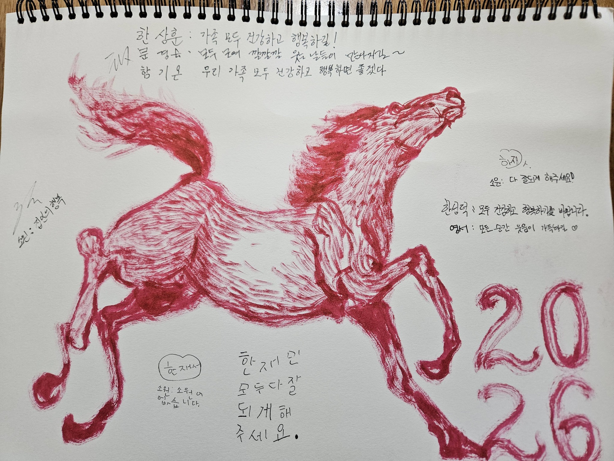 새배를 마치고 이리저리 둘러 앉아 웃고 떠드는데 큰 손녀가 스케치 북에 붉은 말 그림을 가지고 와서 올 해 소원을 쓰라고 했다.